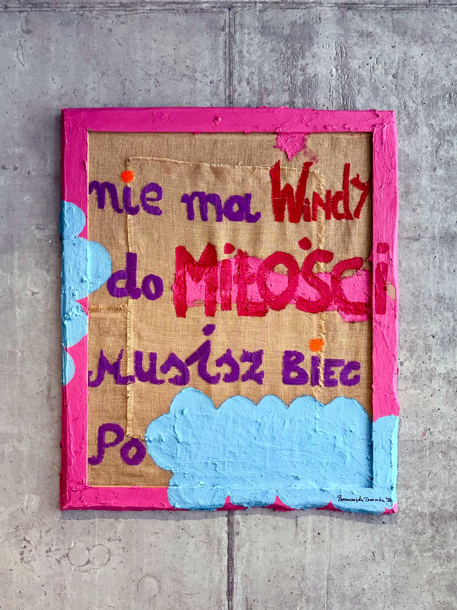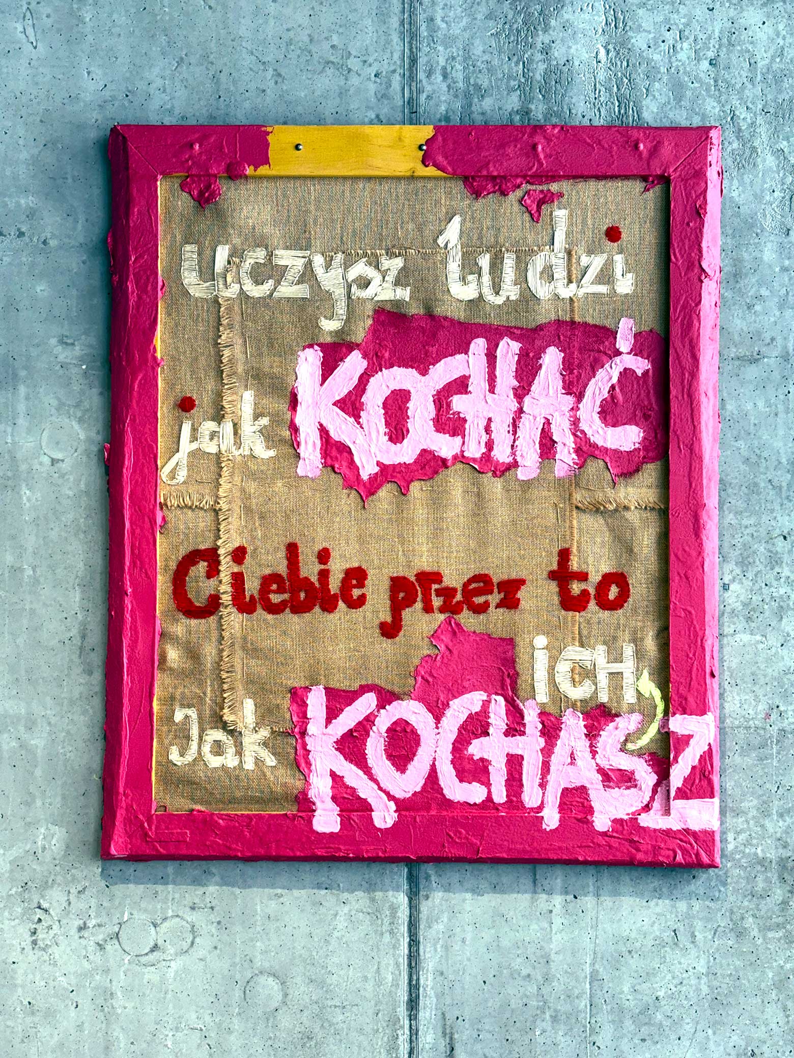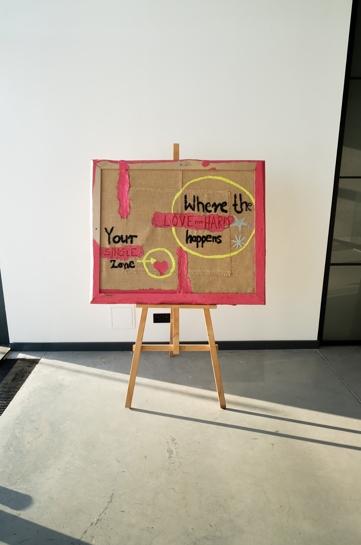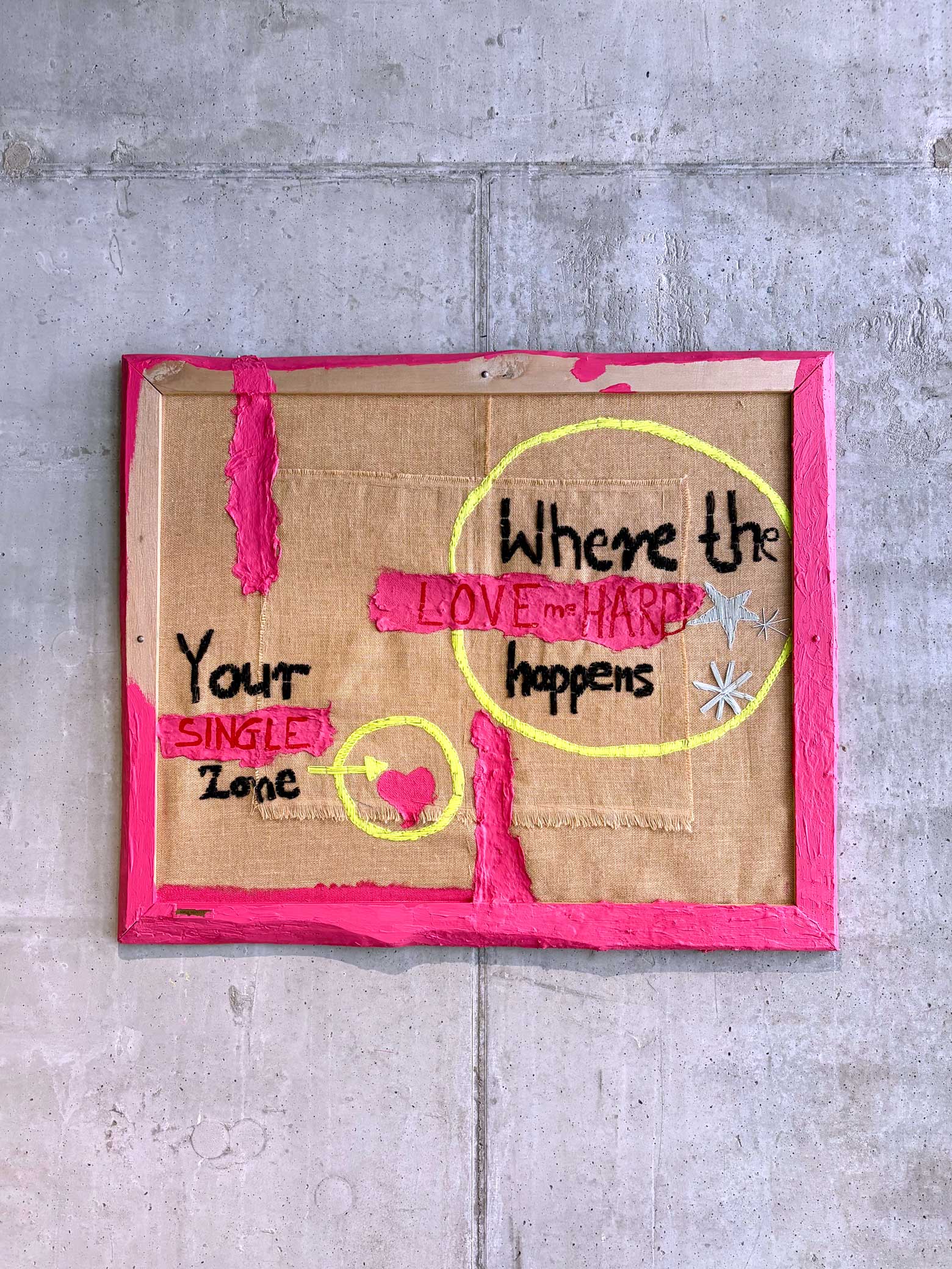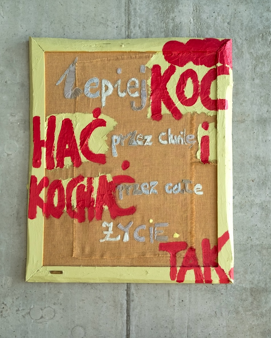The painting belongs to the Be Yourself x Love Me Hard collection, in which the creative process is directly connected to personal experience and extended over time. The work was begun in 2013 and completed in 2025, making time one of the key, yet invisible, elements of the work. The composition is based on a dialogue between delicacy and intensity. A layer of jute with visible stitching and joints creates a backdrop for the embroidered words—records of relationships, messages, and emotions that shape how we learn about closeness.