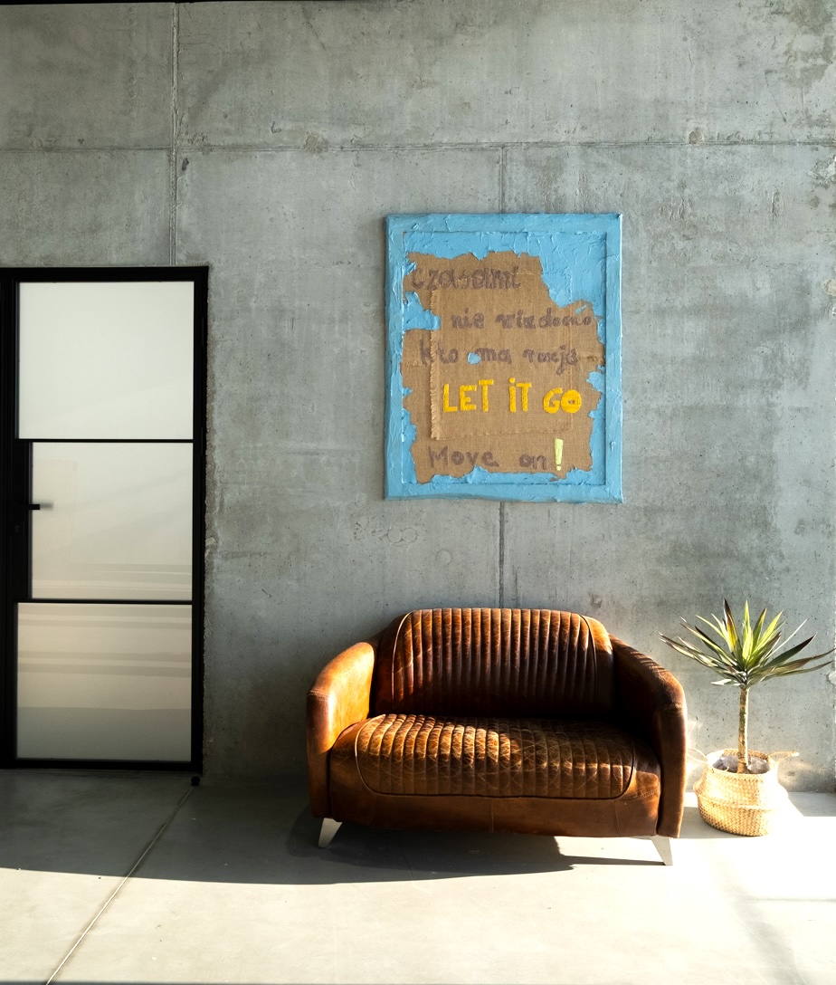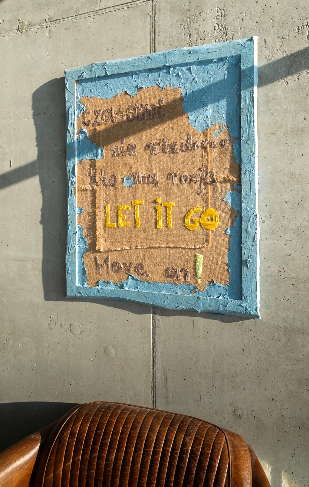 The artist’s paste, applied with a sculptural gesture, partially covers and reveals the surface, creating a sense of transformation. The intense, hand-embroidered inscription “LET IT GO” becomes the climax—a moment of letting go, which is not resignation, but a conscious choice to move forward. “MOVE ON” does not mean escape, but rather a consequence of inner work and a consent to continue onward.