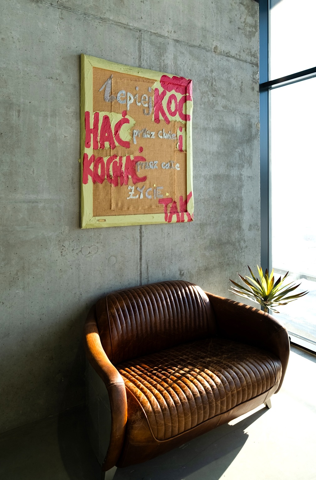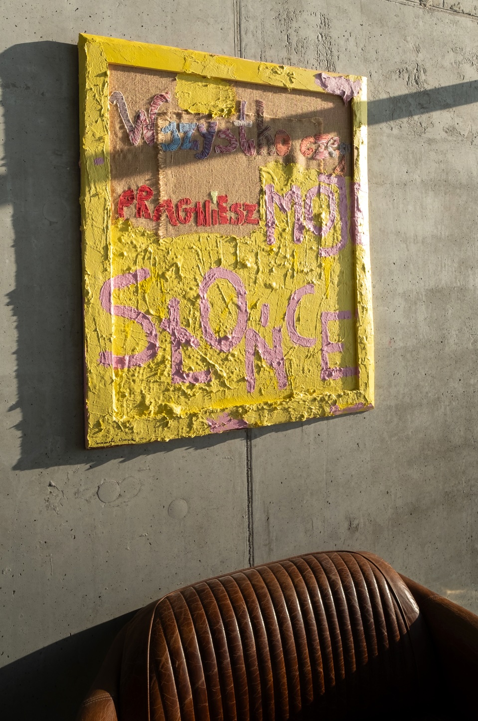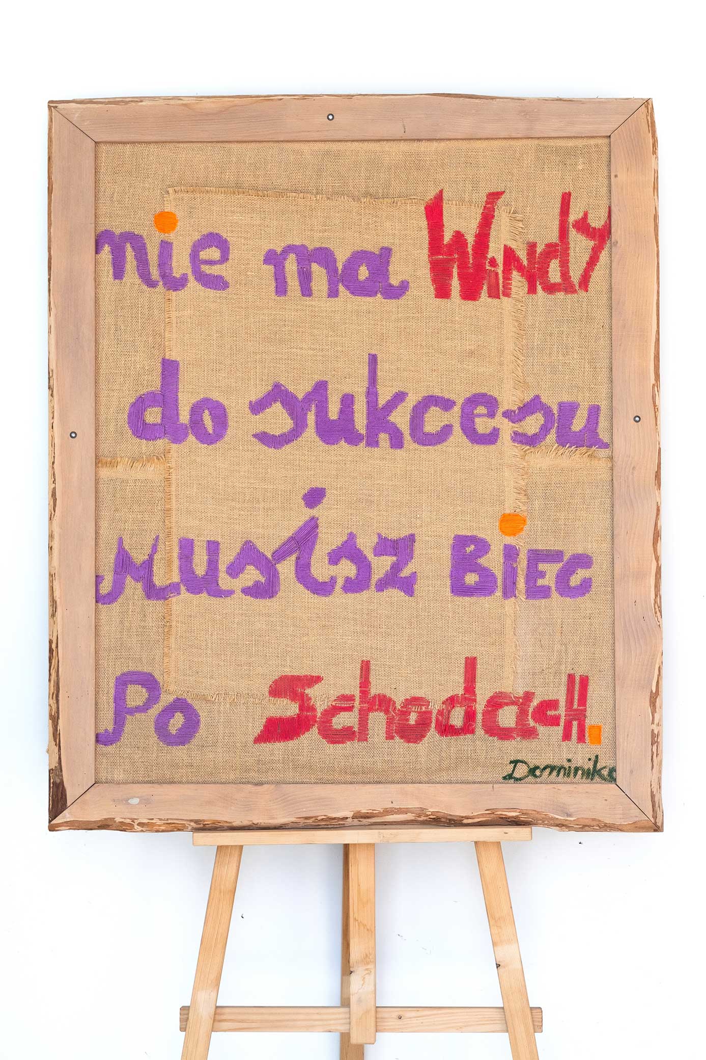 The composition is based on the tension between rawness and tenderness. The layer of jute—with its visible stitching and traces of joints—becomes a metaphor for situations in which it’s difficult to clearly determine who is right. The embroidered words create an emotional record, almost an internal monologue leading from uncertainty to decision.
