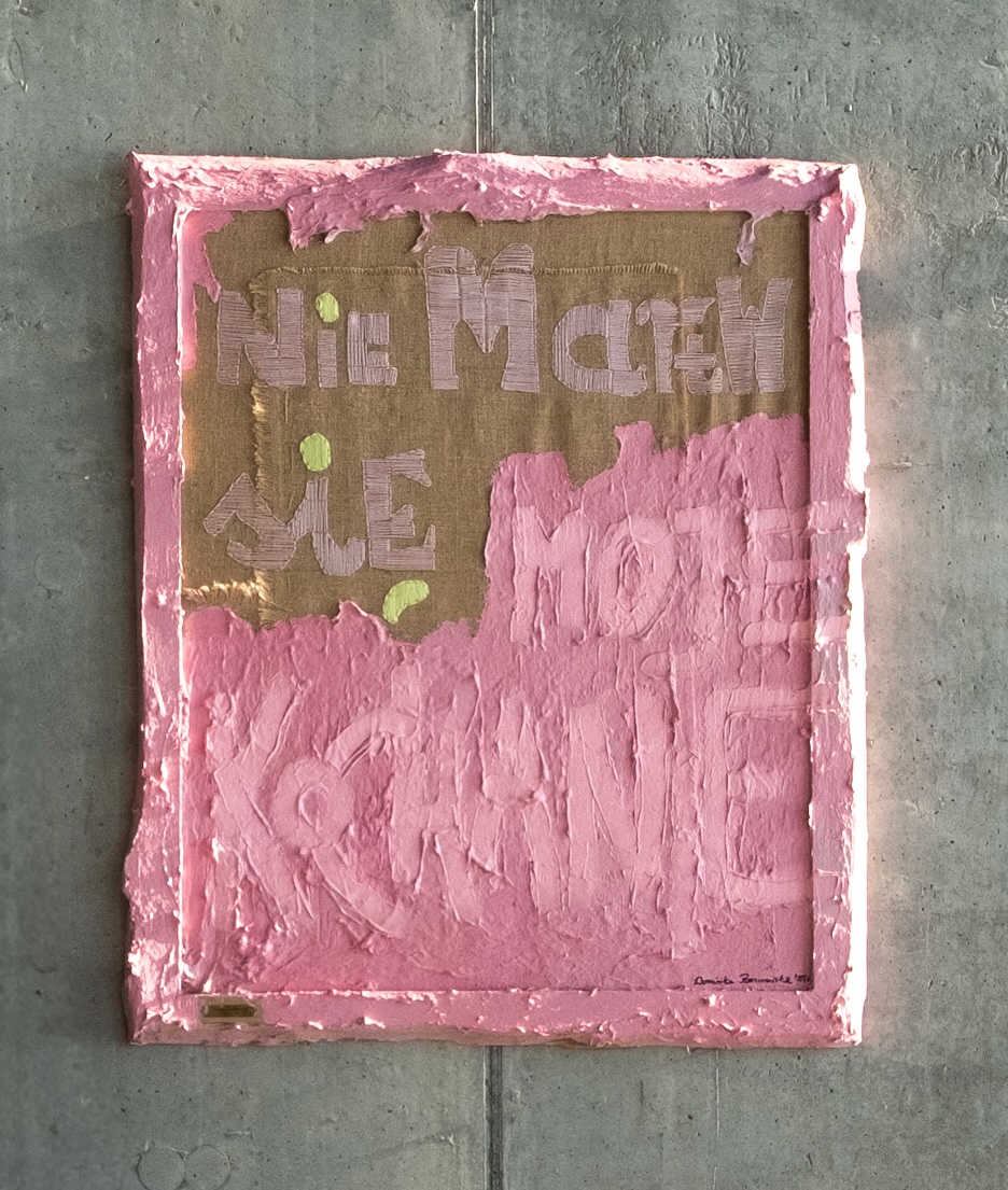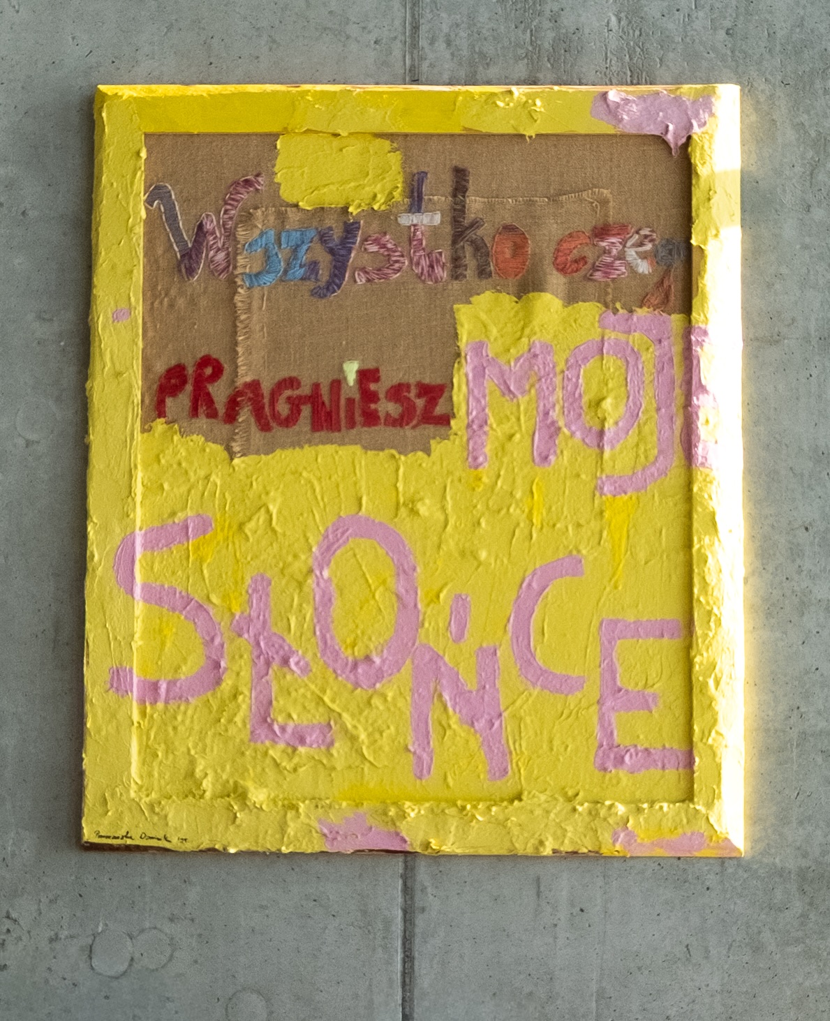 The layered structural mass partially obscures the text, introducing physical resistance to its reception. The material not only builds the surface of the painting but also becomes a metaphor for the barriers that must be crossed to reach meaning. The hand-embroidered embroidery with floss introduces an element of intimacy and personal record, contrasting with the austerity of the structure and the directness of the message.