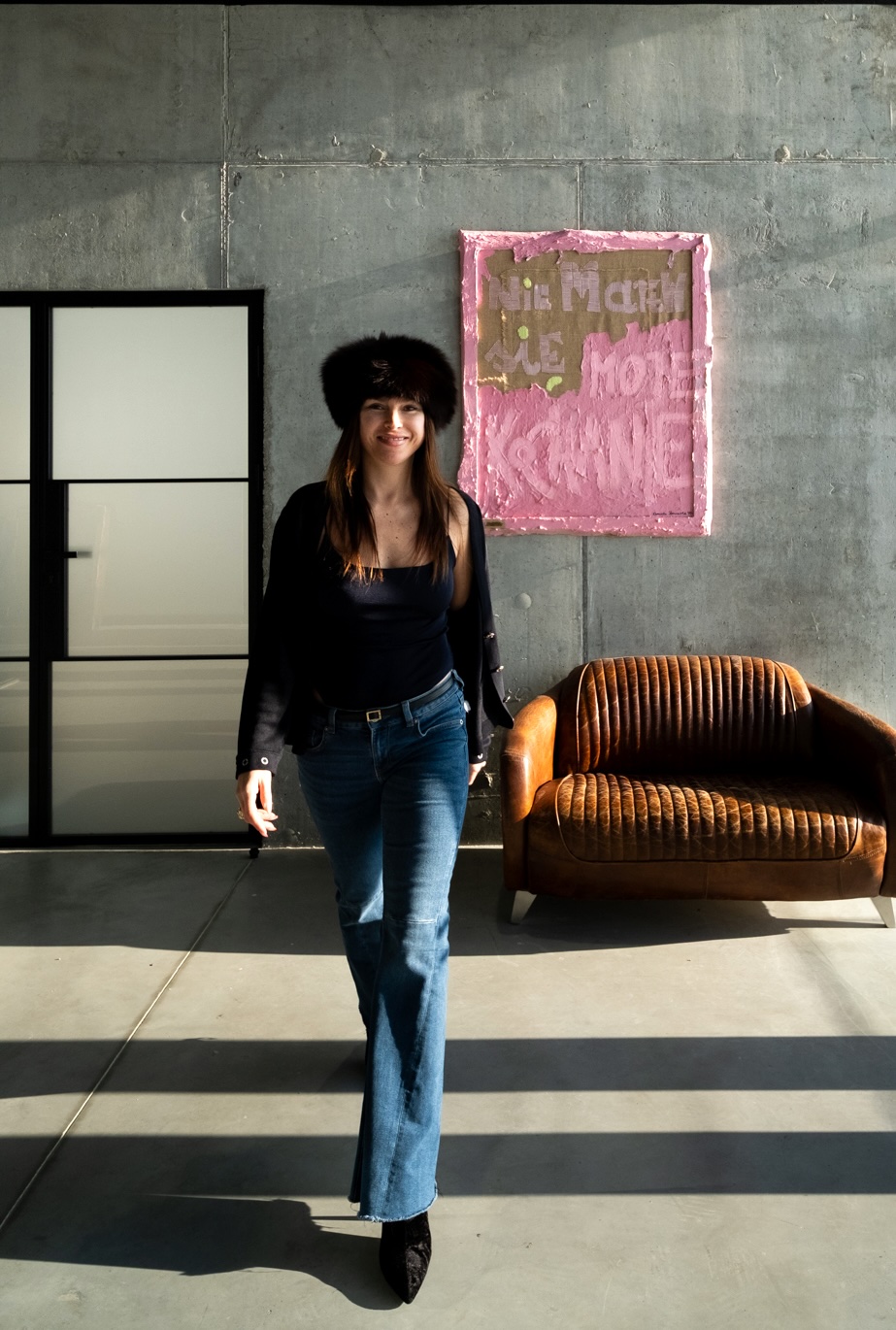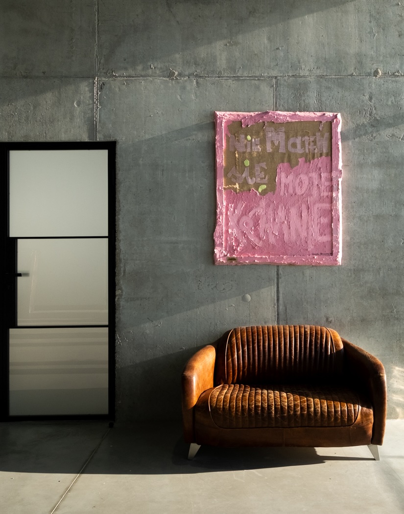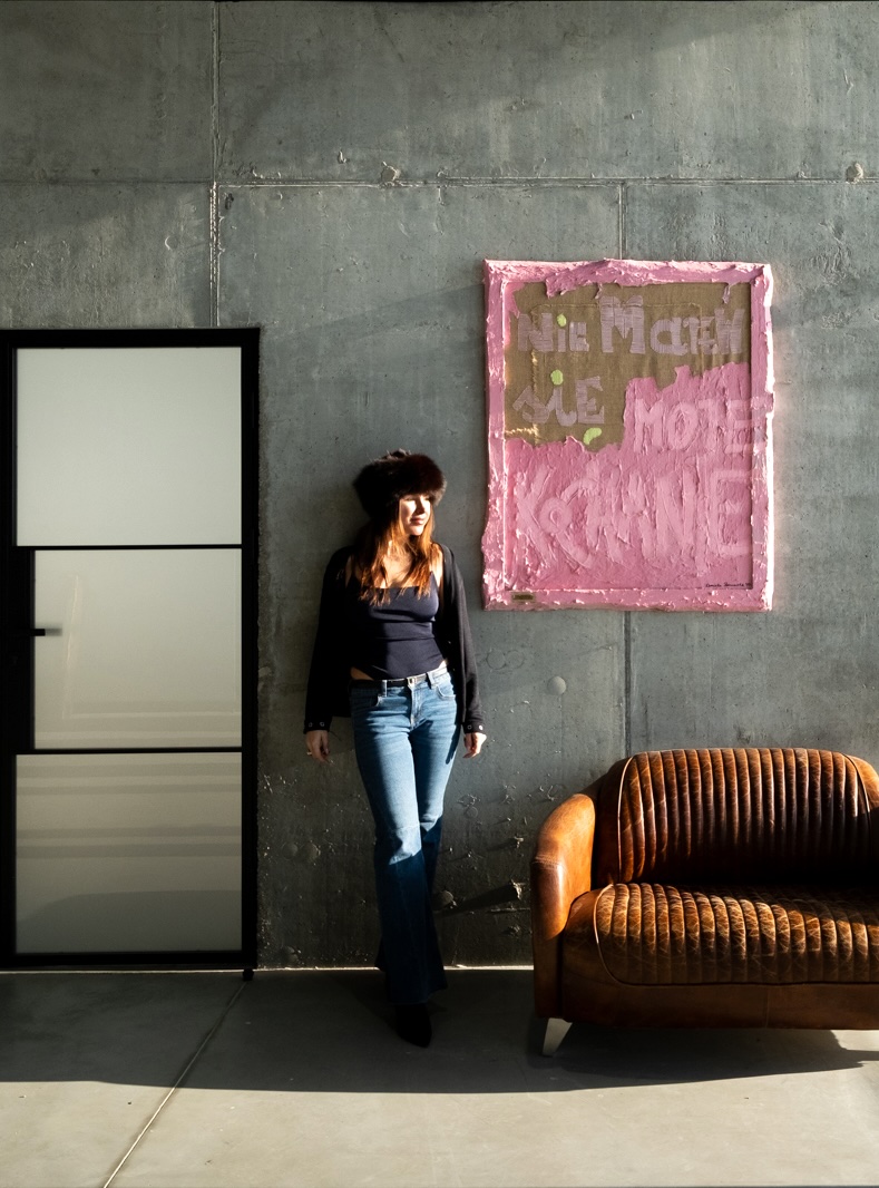 The collection began with the “Be Yourself” series—hand-embroidered paintings on jute, reflecting on identity, the courage to choose one’s own path, and responsibility for one’s own decisions. In 2025, their transformation began and they expanded into the “Love Me Hard” series, which featured intense, sculptural textures, work with fabric, embroidery, and her own structural mass, which builds the painting’s surface. This process is ongoing—some works have been completed, others remain in further stages of transformation.